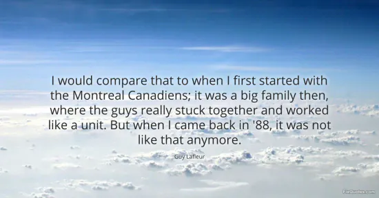 Lafleur, Guy. "I would compare that to when I first started with the Montreal Canadiens; it was a big family then, where the guys really stuck together and worked like a unit. But when I came back in '88, it was not like that anymore." FixQuotes. January 15, 2026. https://fixquotes.com/quotes/i-would-compare-that-to-when-i-first-started-with-54900/.