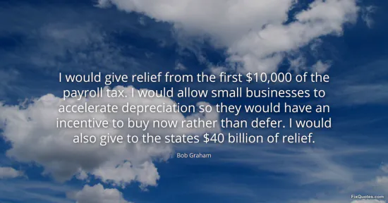 Graham, Bob. (2026, January 16). I would give relief from the first $10,000 of the payroll tax. I would allow small businesses to accelerate depreciation so they would have an incentive to buy now rather than defer. I would also give to the states $40 billion of relief. FixQuotes. https://fixquotes.com/quotes/i-would-give-relief-from-the-first-10000-of-the-131923/