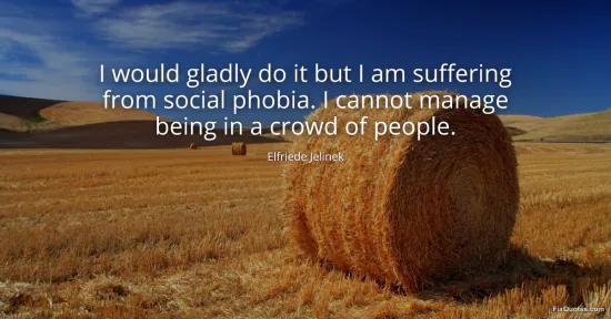 Jelinek, Elfriede. "I would gladly do it but I am suffering from social phobia. I cannot manage being in a crowd of people." FixQuotes. January 18, 2026. https://fixquotes.com/quotes/i-would-gladly-do-it-but-i-am-suffering-from-12593/.