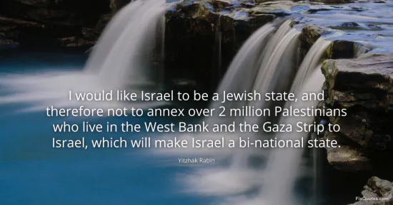 Rabin, Yitzhak. (2026, January 17). I would like Israel to be a Jewish state, and therefore not to annex over 2 million Palestinians who live in the West Bank and the Gaza Strip to Israel, which will make Israel a bi-national state. FixQuotes. https://fixquotes.com/quotes/i-would-like-israel-to-be-a-jewish-state-and-66717/