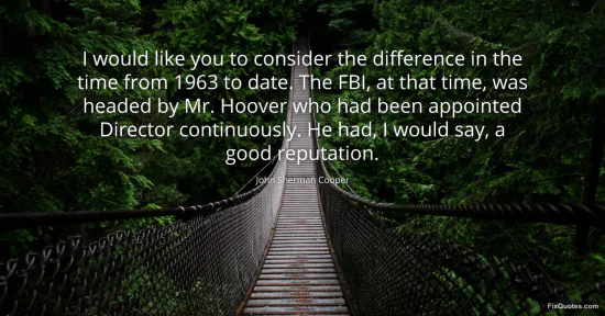 Cooper, John Sherman. "I would like you to consider the difference in the time from 1963 to date. The FBI, at that time, was headed by Mr. Hoover who had been appointed Director continuously. He had, I would say, a good reputation." FixQuotes. January 15, 2026. https://fixquotes.com/quotes/i-would-like-you-to-consider-the-difference-in-151838/.