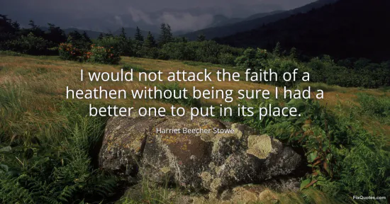 Stowe, Harriet Beecher. "I would not attack the faith of a heathen without being sure I had a better one to put in its place." FixQuotes. January 15, 2026. https://fixquotes.com/quotes/i-would-not-attack-the-faith-of-a-heathen-without-158390/.