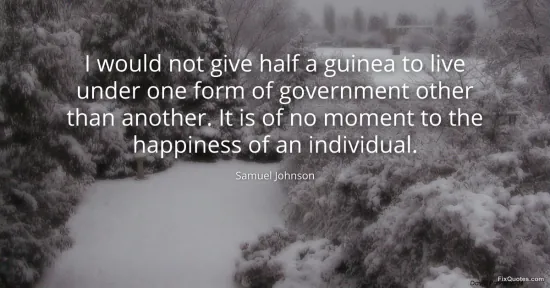 Johnson, Samuel. "I would not give half a guinea to live under one form of government other than another. It is of no moment to the happiness of an individual." FixQuotes. January 18, 2026. https://fixquotes.com/quotes/i-would-not-give-half-a-guinea-to-live-under-one-21056/.