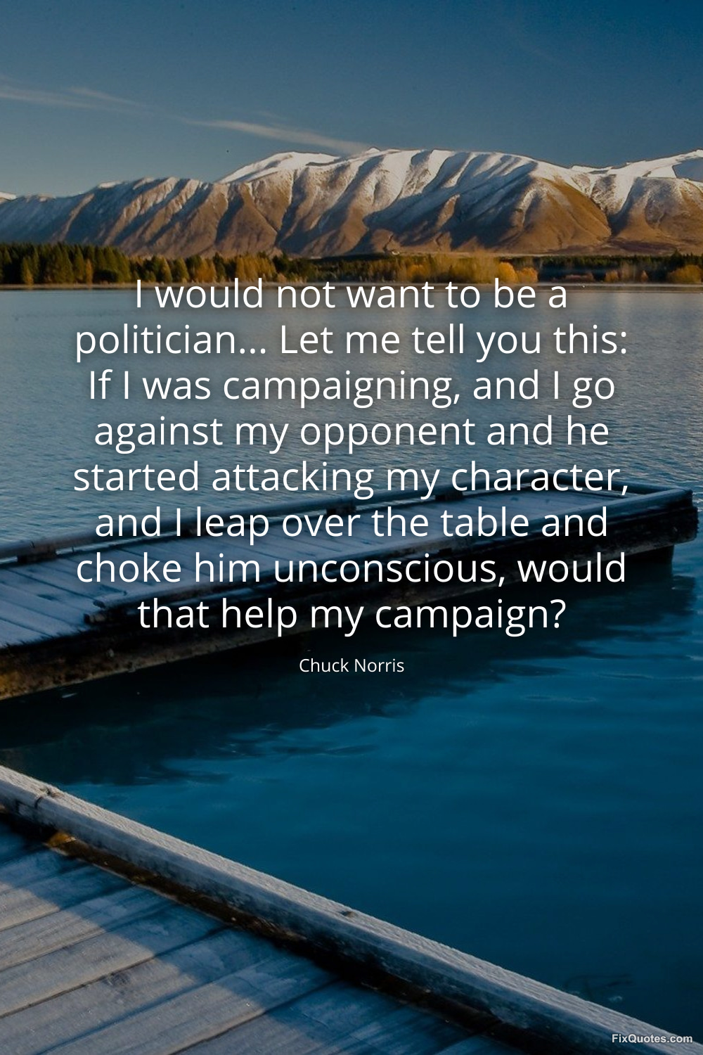 Norris, Chuck. (2026, March 20). I would not want to be a politician... Let me tell you this: If I was campaigning, and I go against my opponent and he started attacking my character, and I leap over the table and choke him unconscious, would that help my campaign? FixQuotes. https://fixquotes.com/quotes/i-would-not-want-to-be-a-politician-let-me-tell-186219/