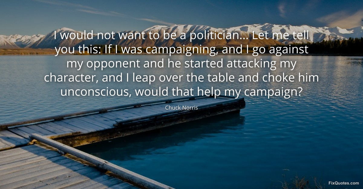 Norris, Chuck. "I would not want to be a politician... Let me tell you this: If I was campaigning, and I go against my opponent and he started attacking my character, and I leap over the table and choke him unconscious, would that help my campaign?" FixQuotes. March 20, 2026. https://fixquotes.com/quotes/i-would-not-want-to-be-a-politician-let-me-tell-186219/.