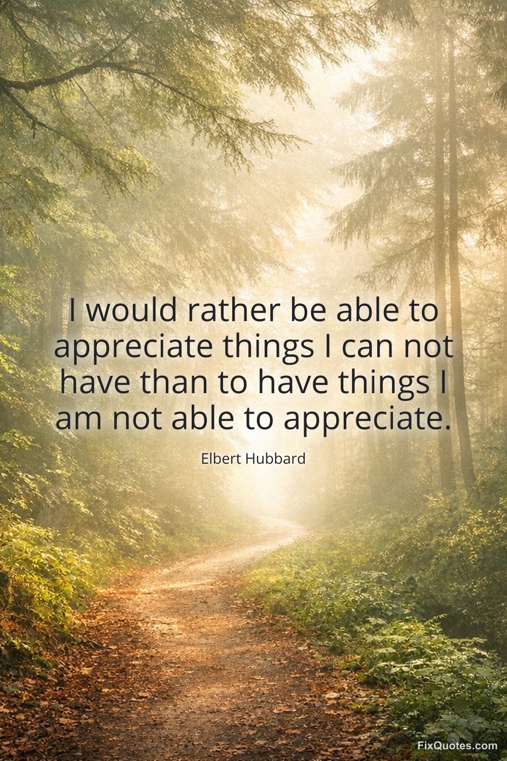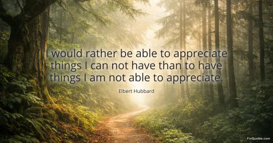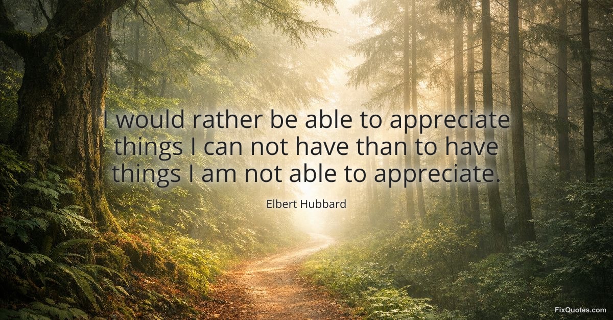 Hubbard, Elbert. "I would rather be able to appreciate things I can not have than to have things I am not able to appreciate." FixQuotes. January 13, 2026. https://fixquotes.com/quotes/i-would-rather-be-able-to-appreciate-things-i-can-19241/.