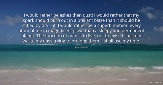 London, Jack. (2026, February 8). I would rather be ashes than dust! I would rather that my spark should burn out in a brilliant blaze than it should be stifled by dry-rot. I would rather be a superb meteor, every atom of me in magnificent glow, than a sleepy and permanent planet. The function of man is to live, not to exist. I shall not waste my days trying to prolong them. I shall use my time. FixQuotes. https://fixquotes.com/quotes/i-would-rather-be-ashes-than-dust-i-would-rather-173093/