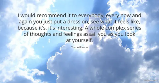 Wilkinson, Tom. "I would recommend it to everybody, every now and again you just put a dress on, see what it feels like, because it's, it's interesting. A whole complex series of thoughts and feelings assail you as you look at yourself." FixQuotes. February 17, 2026. https://fixquotes.com/quotes/i-would-recommend-it-to-everybody-every-now-and-124371/.