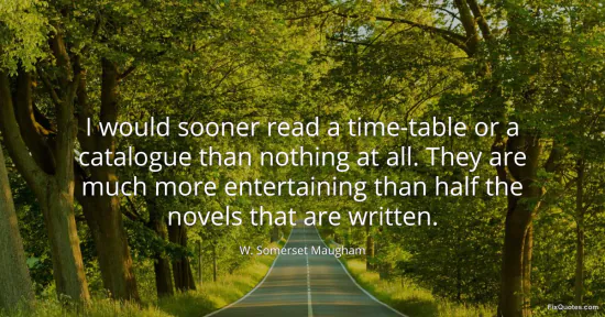 Maugham, W. Somerset. (2026, January 15). I would sooner read a time-table or a catalogue than nothing at all. They are much more entertaining than half the novels that are written. FixQuotes. https://fixquotes.com/quotes/i-would-sooner-read-a-time-table-or-a-catalogue-2625/
