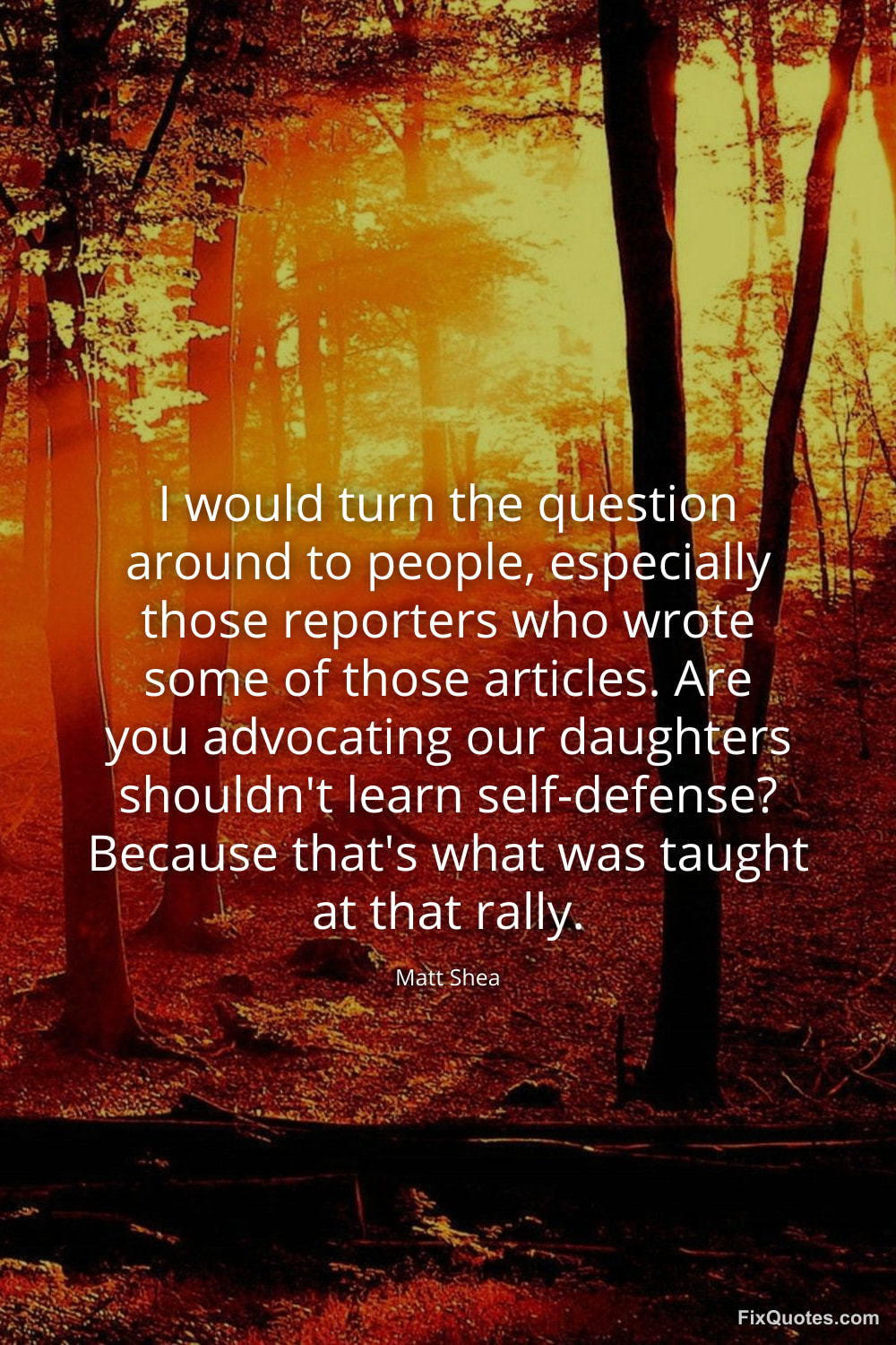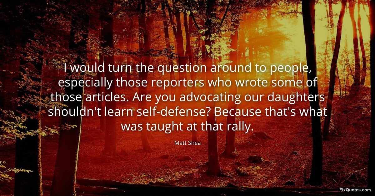 Shea, Matt. (2026, February 9). I would turn the question around to people, especially those reporters who wrote some of those articles. Are you advocating our daughters shouldn't learn self-defense? Because that's what was taught at that rally. FixQuotes. https://fixquotes.com/quotes/i-would-turn-the-question-around-to-people-185000/