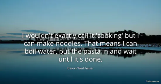 Werkheiser, Devon. "I wouldn't exactly call it 'cooking' but I can make noodles. That means I can boil water, put the pasta in and wait until it's done." FixQuotes. January 16, 2026. https://fixquotes.com/quotes/i-wouldnt-exactly-call-it-cooking-but-i-can-make-111291/.