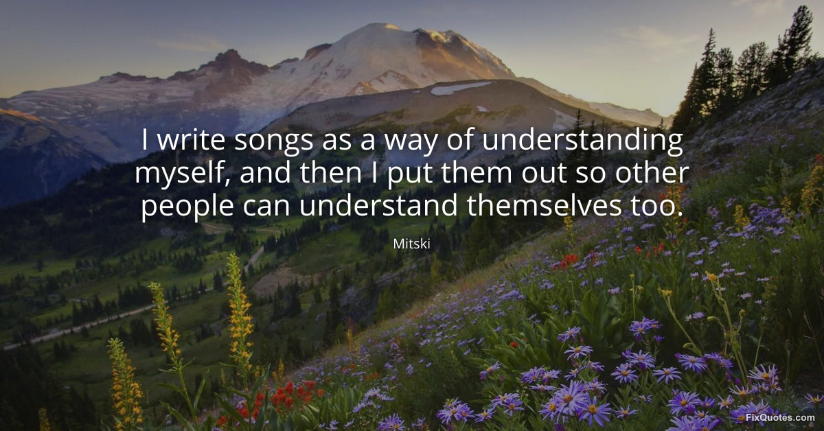 Mitski. (2026, January 30). I write songs as a way of understanding myself, and then I put them out so other people can understand themselves too. FixQuotes. https://fixquotes.com/quotes/i-write-songs-as-a-way-of-understanding-myself-184723/