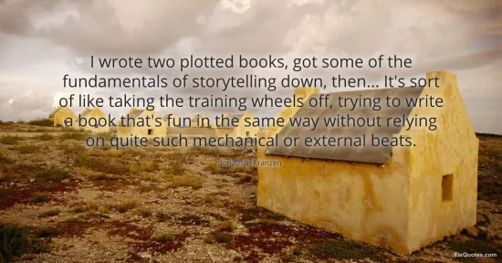 Franzen, Jonathan. "I wrote two plotted books, got some of the fundamentals of storytelling down, then... It's sort of like taking the training wheels off, trying to write a book that's fun in the same way without relying on quite such mechanical or external beats." FixQuotes. February 18, 2026. https://fixquotes.com/quotes/i-wrote-two-plotted-books-got-some-of-the-73314/.