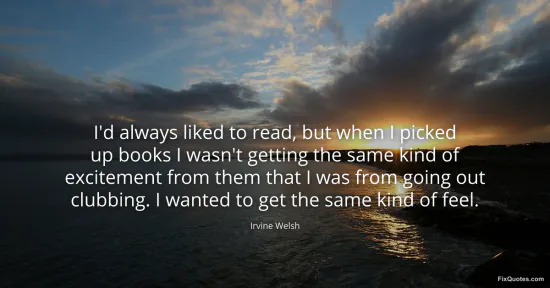 Welsh, Irvine. "I'd always liked to read, but when I picked up books I wasn't getting the same kind of excitement from them that I was from going out clubbing. I wanted to get the same kind of feel." FixQuotes. January 15, 2026. https://fixquotes.com/quotes/id-always-liked-to-read-but-when-i-picked-up-151002/.