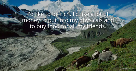 Barrett, Syd. "I'd like to be rich. I'd like a lot of money to put into my physicals and to buy food for all my friends." FixQuotes. January 17, 2026. https://fixquotes.com/quotes/id-like-to-be-rich-id-like-a-lot-of-money-to-put-26034/.