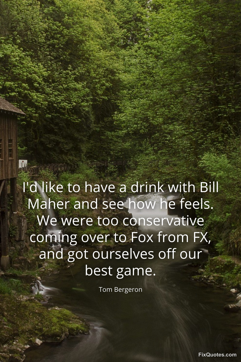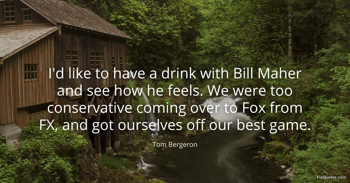 Bergeron, Tom. (2026, February 17). I'd like to have a drink with Bill Maher and see how he feels. We were too conservative coming over to Fox from FX, and got ourselves off our best game. FixQuotes. https://fixquotes.com/quotes/id-like-to-have-a-drink-with-bill-maher-and-see-112903/