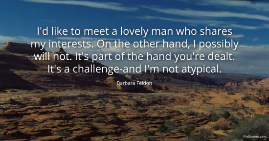 Feldon, Barbara. (2026, January 15). I'd like to meet a lovely man who shares my interests. On the other hand, I possibly will not. It's part of the hand you're dealt. It's a challenge-and I'm not atypical. FixQuotes. https://fixquotes.com/quotes/id-like-to-meet-a-lovely-man-who-shares-my-157774/