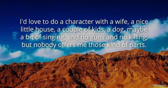 Walken, Christopher. "I'd love to do a character with a wife, a nice little house, a couple of kids, a dog, maybe a bit of singing, and no guns and no killing, but nobody offers me those kind of parts." FixQuotes. January 17, 2026. https://fixquotes.com/quotes/id-love-to-do-a-character-with-a-wife-a-nice-66333/.