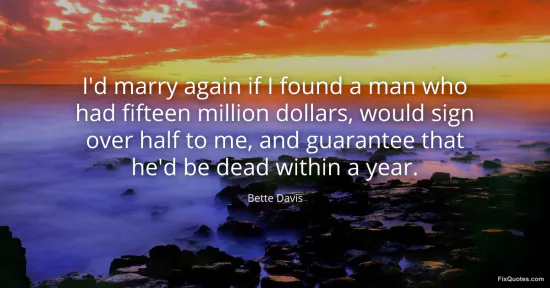Davis, Bette. "I'd marry again if I found a man who had fifteen million dollars, would sign over half to me, and guarantee that he'd be dead within a year." FixQuotes. January 18, 2026. https://fixquotes.com/quotes/id-marry-again-if-i-found-a-man-who-had-fifteen-4987/.