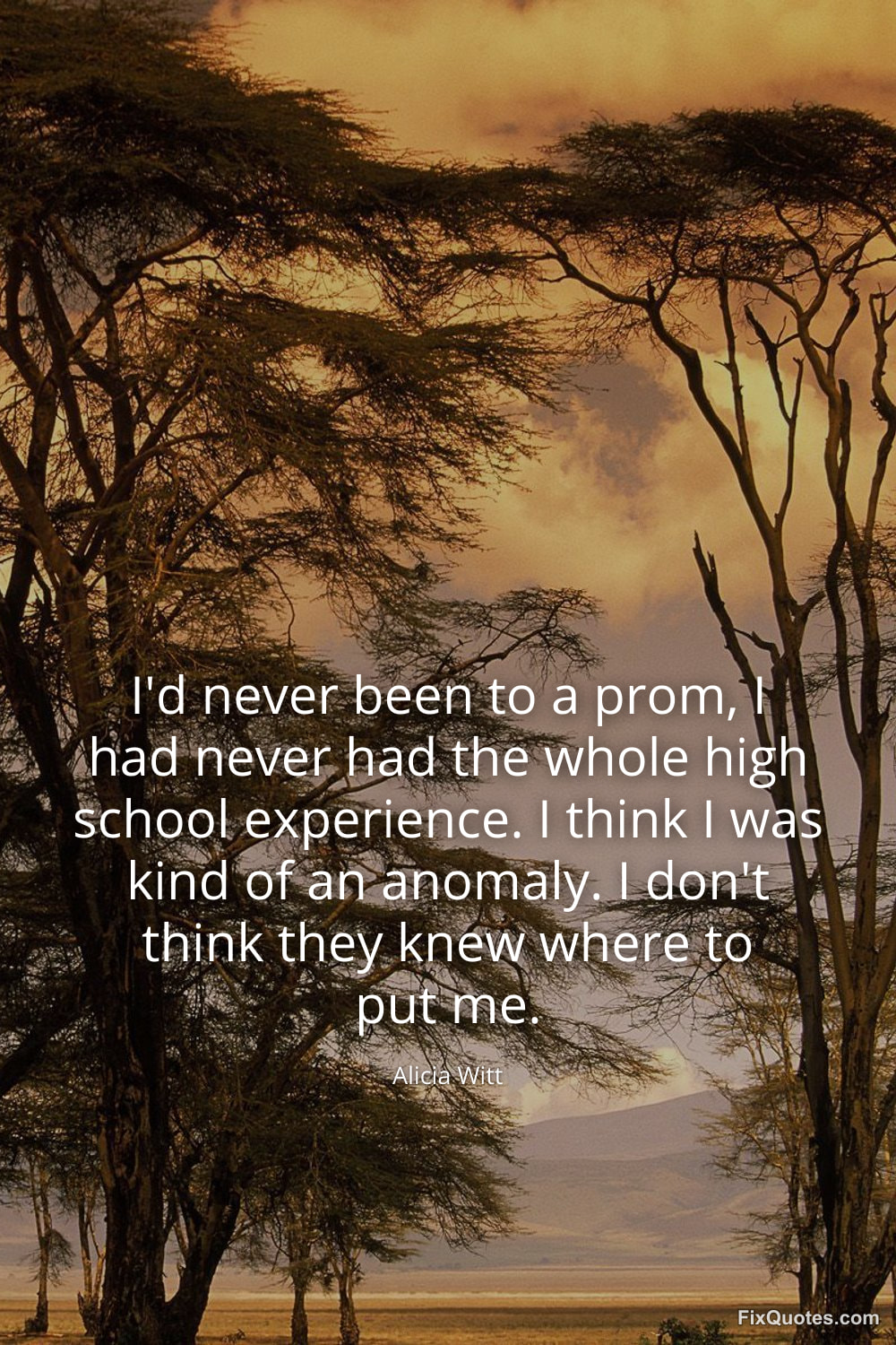 Witt, Alicia. "I'd never been to a prom, I had never had the whole high school experience. I think I was kind of an anomaly. I don't think they knew where to put me." FixQuotes. January 15, 2026. https://fixquotes.com/quotes/id-never-been-to-a-prom-i-had-never-had-the-whole-157687/.