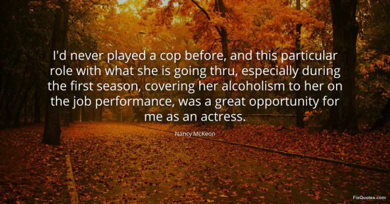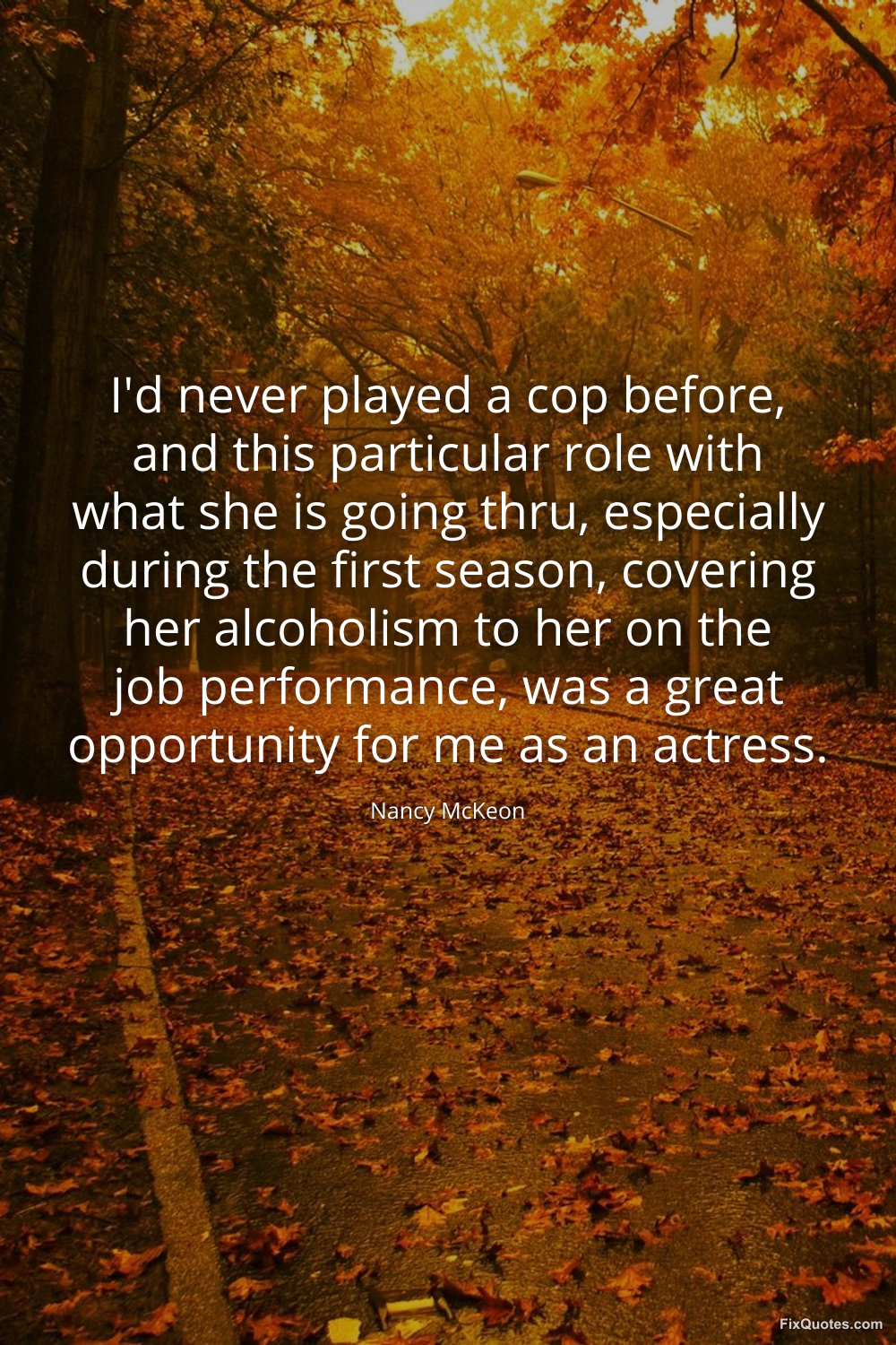 McKeon, Nancy. (2026, January 16). I'd never played a cop before, and this particular role with what she is going thru, especially during the first season, covering her alcoholism to her on the job performance, was a great opportunity for me as an actress. FixQuotes. https://fixquotes.com/quotes/id-never-played-a-cop-before-and-this-particular-134233/
