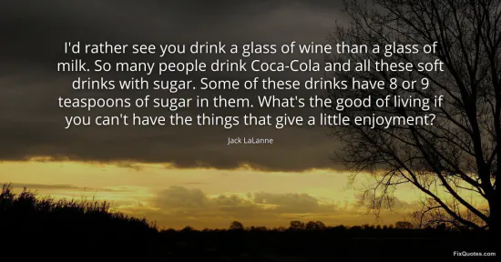 LaLanne, Jack. (2026, February 18). I'd rather see you drink a glass of wine than a glass of milk. So many people drink Coca-Cola and all these soft drinks with sugar. Some of these drinks have 8 or 9 teaspoons of sugar in them. What's the good of living if you can't have the things that give a little enjoyment? FixQuotes. https://fixquotes.com/quotes/id-rather-see-you-drink-a-glass-of-wine-than-a-86024/