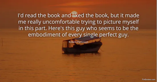 Pattinson, Robert. "I'd read the book and liked the book, but it made me really uncomfortable trying to picture myself in this part. Here's this guy who seems to be the embodiment of every single perfect guy." FixQuotes. January 16, 2026. https://fixquotes.com/quotes/id-read-the-book-and-liked-the-book-but-it-made-136431/.