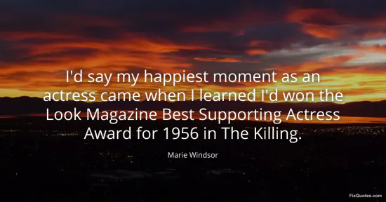 Windsor, Marie. "I'd say my happiest moment as an actress came when I learned I'd won the Look Magazine Best Supporting Actress Award for 1956 in The Killing." FixQuotes. January 17, 2026. https://fixquotes.com/quotes/id-say-my-happiest-moment-as-an-actress-came-when-49298/.