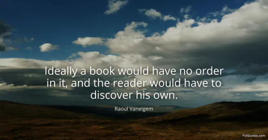 Vaneigem, Raoul. (2026, January 16). Ideally a book would have no order in it, and the reader would have to discover his own. FixQuotes. https://fixquotes.com/quotes/ideally-a-book-would-have-no-order-in-it-and-the-134515/