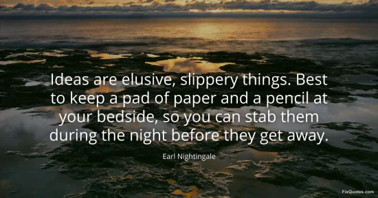 Nightingale, Earl. "Ideas are elusive, slippery things. Best to keep a pad of paper and a pencil at your bedside, so you can stab them during the night before they get away." FixQuotes. January 18, 2026. https://fixquotes.com/quotes/ideas-are-elusive-slippery-things-best-to-keep-a-14398/.