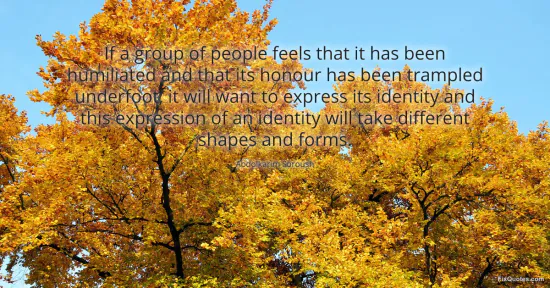 "If a group of people feels that it has been humiliated and that its honour has been trampled underfoot, it will want to express its identity and this expression of an identity will take different shapes and forms." FixQuotes, 15 Jan. 2026, https://fixquotes.com/quotes/if-a-group-of-people-feels-that-it-has-been-144654/. Accessed 11 Feb. 2026.
