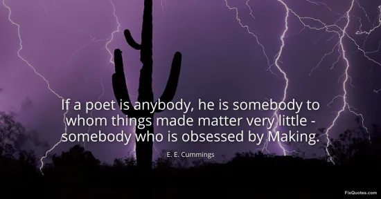 Cummings, E. E. "If a poet is anybody, he is somebody to whom things made matter very little - somebody who is obsessed by Making." FixQuotes. January 18, 2026. https://fixquotes.com/quotes/if-a-poet-is-anybody-he-is-somebody-to-whom-13962/.