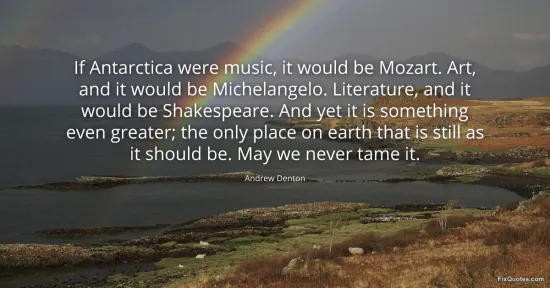 Denton, Andrew. "If Antarctica were music, it would be Mozart. Art, and it would be Michelangelo. Literature, and it would be Shakespeare. And yet it is something even greater; the only place on earth that is still as it should be. May we never tame it." FixQuotes. February 19, 2026. https://fixquotes.com/quotes/if-antarctica-were-music-it-would-be-mozart-art-35303/.