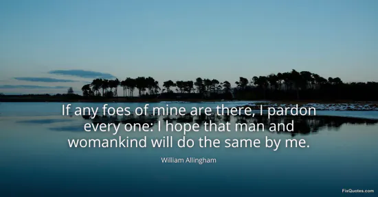 Allingham, William. "If any foes of mine are there, I pardon every one: I hope that man and womankind will do the same by me." FixQuotes. January 18, 2026. https://fixquotes.com/quotes/if-any-foes-of-mine-are-there-i-pardon-every-one-11170/.