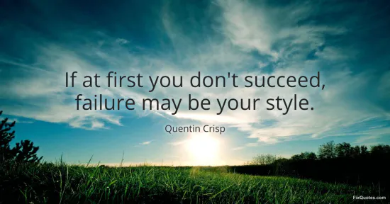Quentin Crisp turns a saccharine self-help axiom into a needle, and you can feel the punk pleasure of the puncture. "If at first you don't succeed" is usually the prelude to moral uplift: try harder, polish yourself, earn belonging. Crisp yanks the ladder away. "Failure may be your style" reframes non-achievement not as a temporary setback but as an aesthetic and social identity. The joke lands because it treats "style" - that supposedly frivolous surface category - as the real battleground where society rewards conformity and punishes difference.