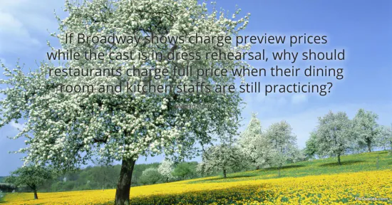 "If Broadway shows charge preview prices while the cast is in dress rehearsal, why should restaurants charge full price when their dining room and kitchen staffs are still practicing?" FixQuotes, 16 Jan. 2026, https://fixquotes.com/quotes/if-broadway-shows-charge-preview-prices-while-the-114505/. Accessed 13 Feb. 2026.