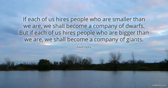 Ogilvy, David. (2026, January 13). If each of us hires people who are smaller than we are, we shall become a company of dwarfs. But if each of us hires people who are bigger than we are, we shall become a company of giants. FixQuotes. https://fixquotes.com/quotes/if-each-of-us-hires-people-who-are-smaller-than-30751/