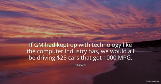 "If GM had kept up with technology like the computer industry has, we would all be driving $25 cars that got 1000 MPG." FixQuotes, 15 Jan. 2026, https://fixquotes.com/quotes/if-gm-had-kept-up-with-technology-like-the-17650/. Accessed 12 Feb. 2026.