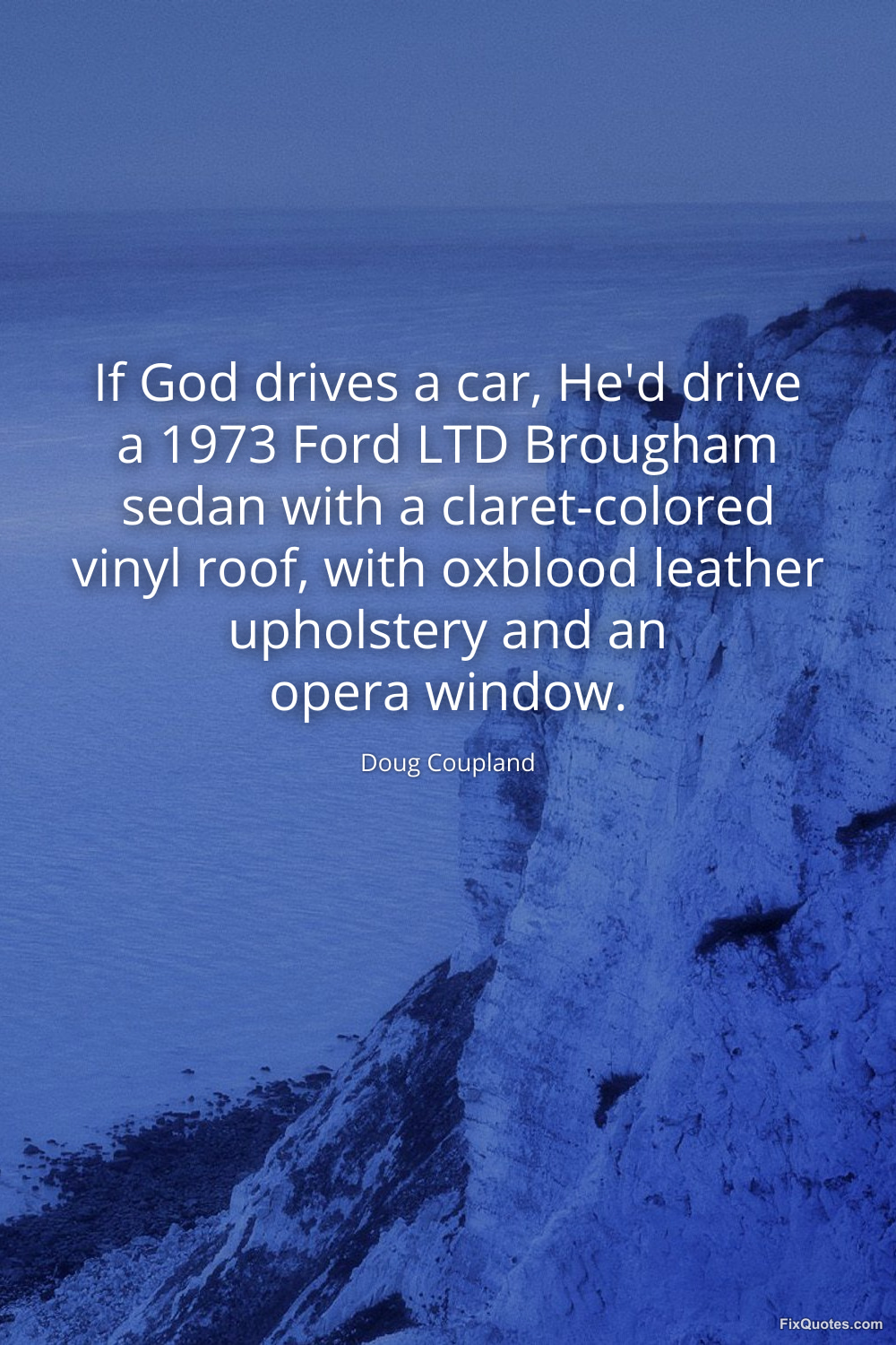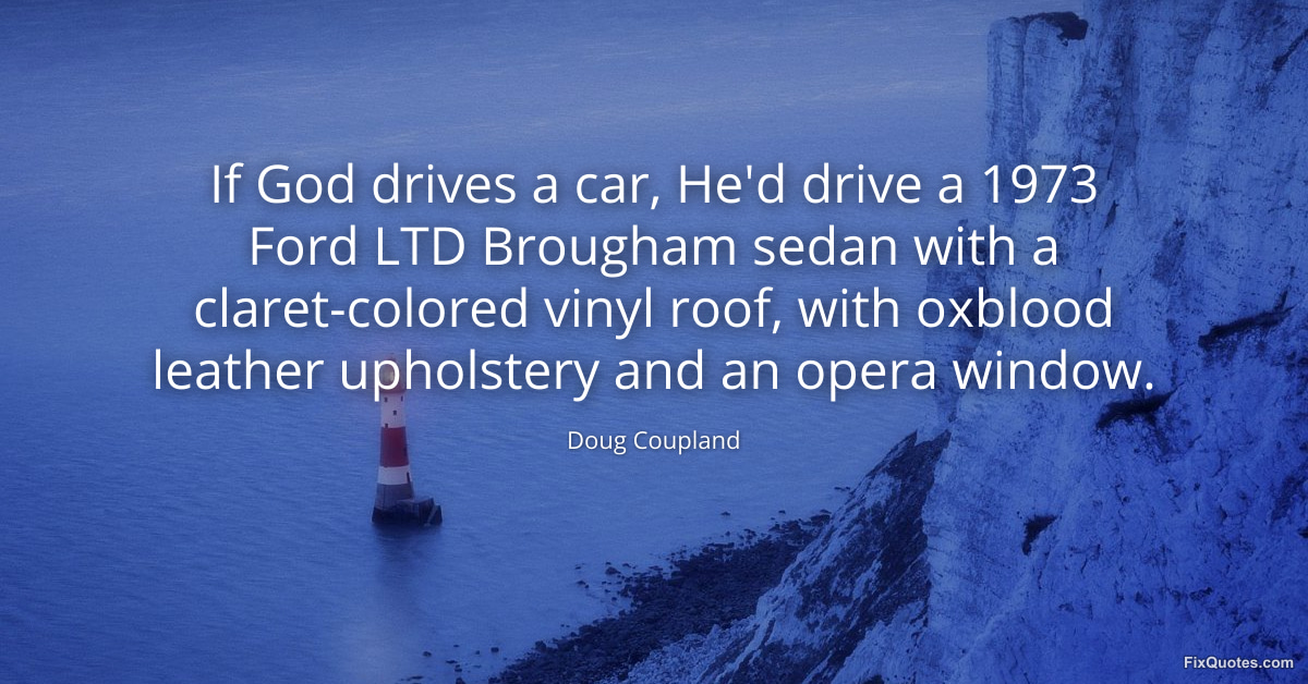 Coupland, Doug. "If God drives a car, He'd drive a 1973 Ford LTD Brougham sedan with a claret-colored vinyl roof, with oxblood leather upholstery and an opera window." FixQuotes. January 17, 2026. https://fixquotes.com/quotes/if-god-drives-a-car-hed-drive-a-1973-ford-ltd-49072/.