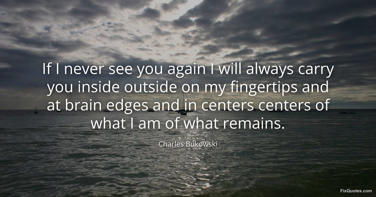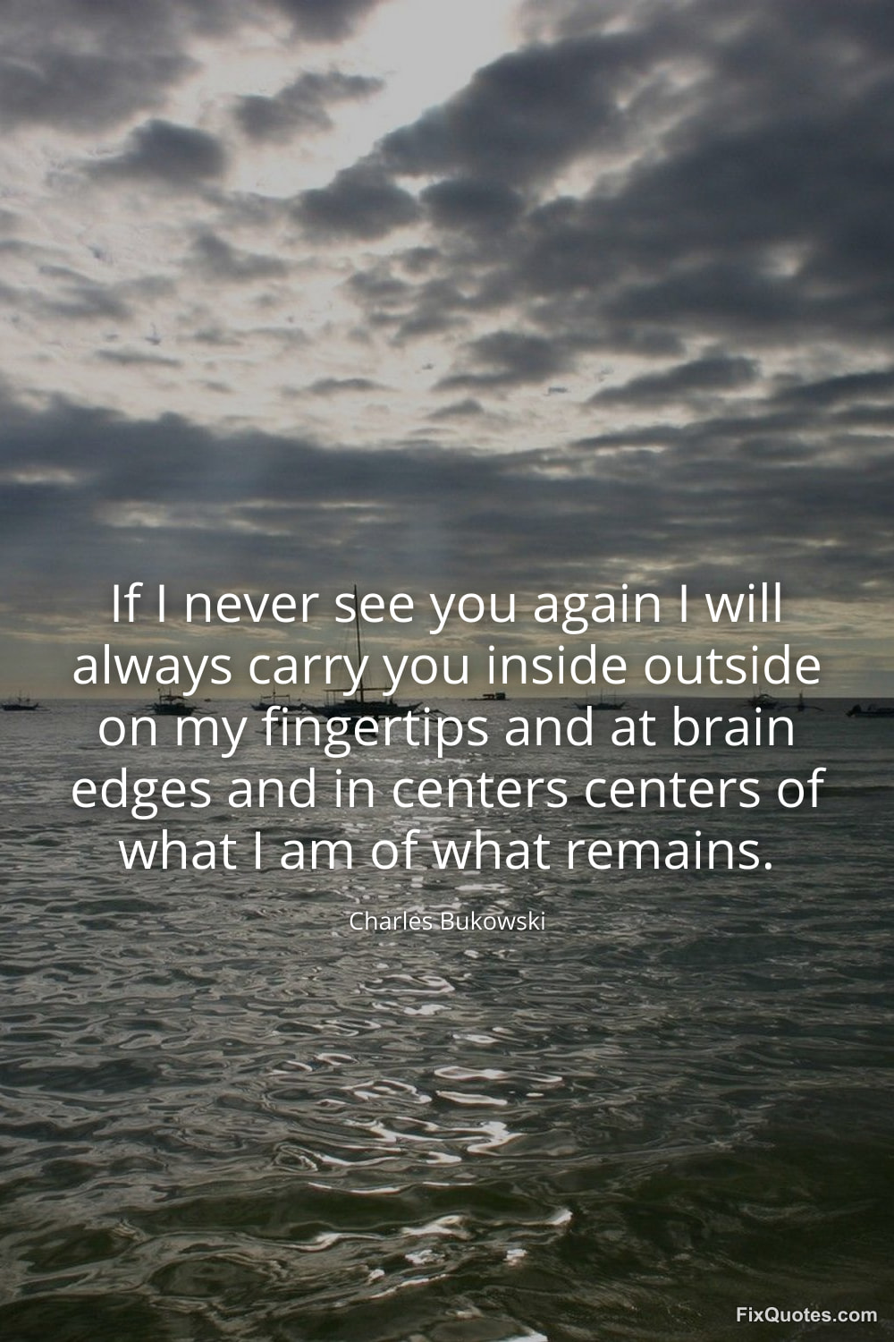 Bukowski, Charles. "If I never see you again I will always carry you inside outside on my fingertips and at brain edges and in centers centers of what I am of what remains." FixQuotes. February 10, 2026. https://fixquotes.com/quotes/if-i-never-see-you-again-i-will-always-carry-you-185189/.