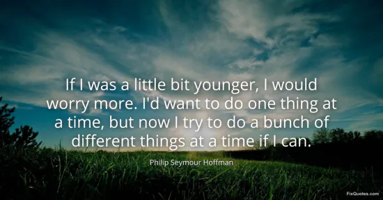 Hoffman, Philip Seymour. "If I was a little bit younger, I would worry more. I'd want to do one thing at a time, but now I try to do a bunch of different things at a time if I can." FixQuotes. February 16, 2026. https://fixquotes.com/quotes/if-i-was-a-little-bit-younger-i-would-worry-more-126691/.