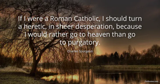 Spurgeon, Charles. (2026, January 15). If I were a Roman Catholic, I should turn a heretic, in sheer desperation, because I would rather go to heaven than go to purgatory. FixQuotes. https://fixquotes.com/quotes/if-i-were-a-roman-catholic-i-should-turn-a-14344/