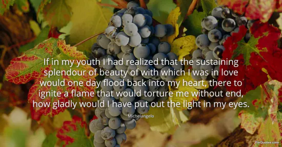 Michelangelo. (2026, January 18). If in my youth I had realized that the sustaining splendour of beauty of with which I was in love would one day flood back into my heart, there to ignite a flame that would torture me without end, how gladly would I have put out the light in my eyes. FixQuotes. https://fixquotes.com/quotes/if-in-my-youth-i-had-realized-that-the-sustaining-22432/