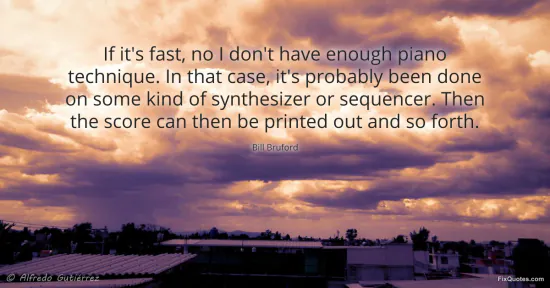 Bruford, Bill. "If it's fast, no I don't have enough piano technique. In that case, it's probably been done on some kind of synthesizer or sequencer. Then the score can then be printed out and so forth." FixQuotes. January 17, 2026. https://fixquotes.com/quotes/if-its-fast-no-i-dont-have-enough-piano-technique-47582/.