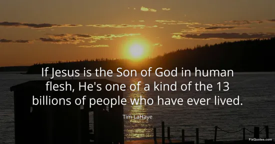LaHaye, Tim. "If Jesus is the Son of God in human flesh, He's one of a kind of the 13 billions of people who have ever lived." FixQuotes. January 16, 2026. https://fixquotes.com/quotes/if-jesus-is-the-son-of-god-in-human-flesh-hes-one-129359/.