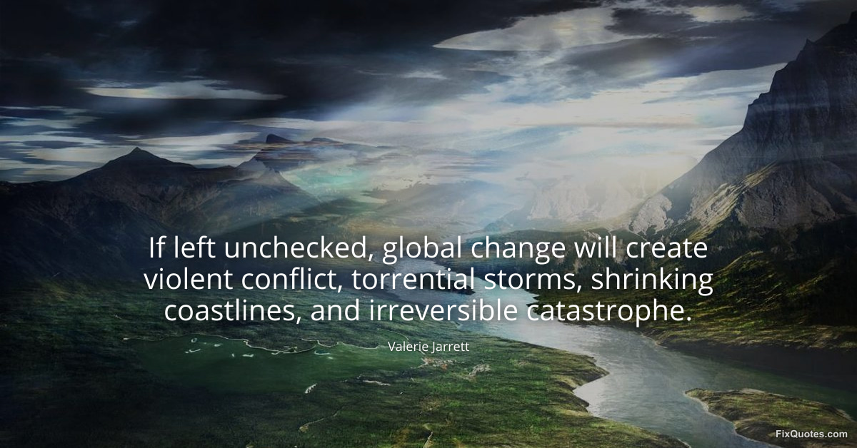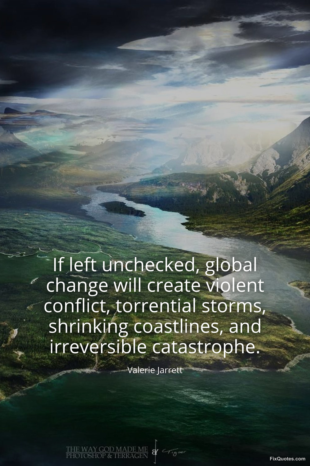 Jarrett, Valerie. (2026, January 16). If left unchecked, global change will create violent conflict, torrential storms, shrinking coastlines, and irreversible catastrophe. FixQuotes. https://fixquotes.com/quotes/if-left-unchecked-global-change-will-create-107702/