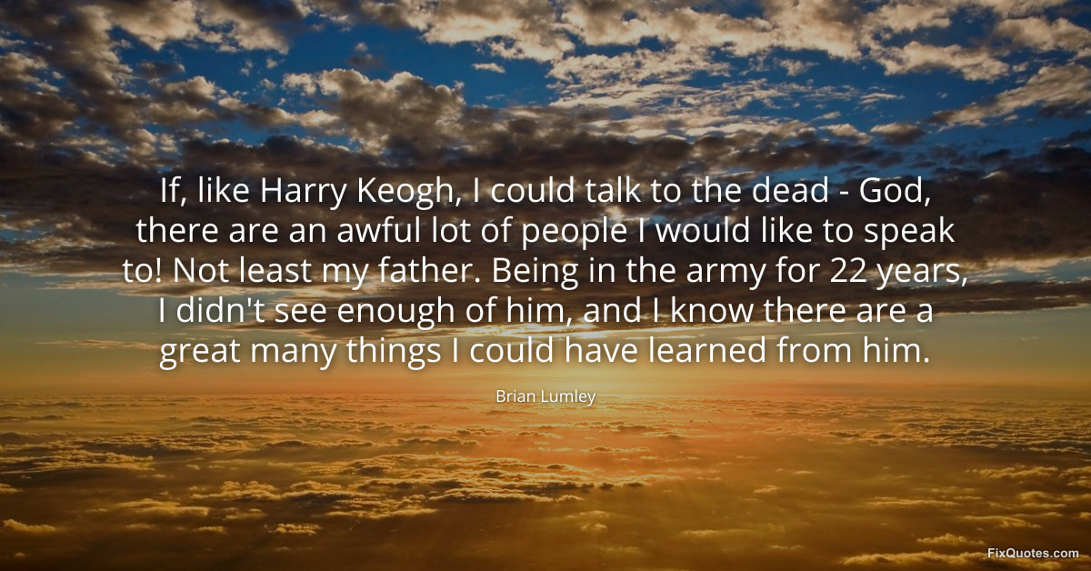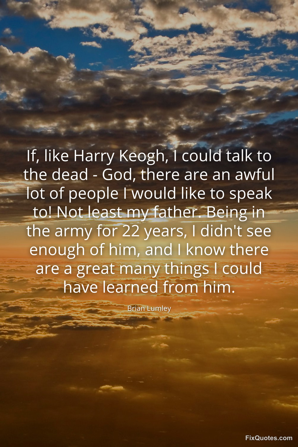 Lumley, Brian. (2026, January 16). If, like Harry Keogh, I could talk to the dead - God, there are an awful lot of people I would like to speak to! Not least my father. Being in the army for 22 years, I didn't see enough of him, and I know there are a great many things I could have learned from him. FixQuotes. https://fixquotes.com/quotes/if-like-harry-keogh-i-could-talk-to-the-dead-132012/