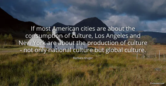 The subtext is about infrastructure and authority. These cities don’t merely host culture; they control the pipelines that decide what gets seen, streamed, published, reviewed, and exported. New York’s galleries, magazines, and finance ecosystems translate aesthetic risk into prestige and capital. Los Angeles does the same with image production at industrial scale, turning narrative and celebrity into a world language. Kruger’s phrasing “not only national... but global” quietly points at cultural imperialism: what starts as local scene becomes a template that other places measure themselves against, whether they want to or not.