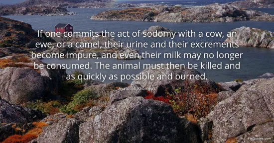 Khomeini, Ayatollah. "If one commits the act of sodomy with a cow, an ewe, or a camel, their urine and their excrements become impure, and even their milk may no longer be consumed. The animal must then be killed and as quickly as possible and burned." FixQuotes. February 25, 2026. https://fixquotes.com/quotes/if-one-commits-the-act-of-sodomy-with-a-cow-an-37517/.
