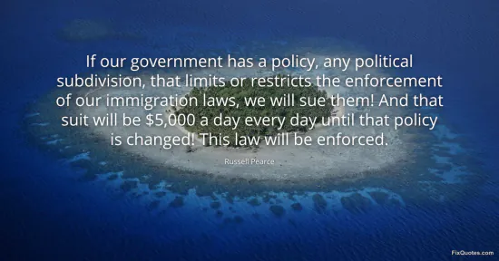 Pearce, Russell. "If our government has a policy, any political subdivision, that limits or restricts the enforcement of our immigration laws, we will sue them! And that suit will be $5,000 a day every day until that policy is changed! This law will be enforced." FixQuotes. January 16, 2026. https://fixquotes.com/quotes/if-our-government-has-a-policy-any-political-97032/.